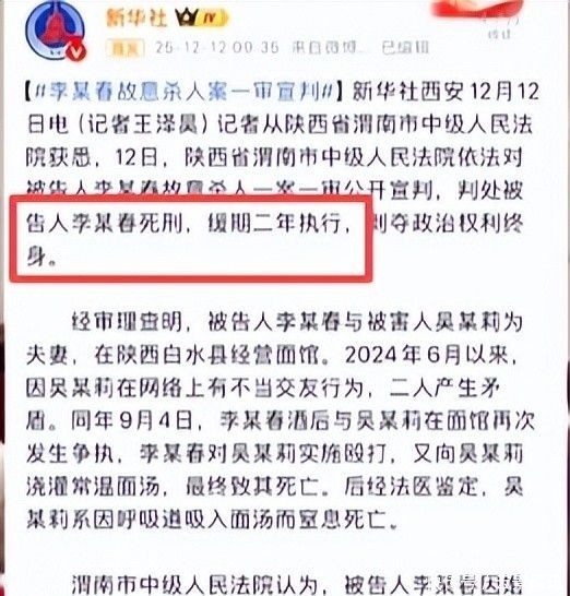 无论如何,正义终归显现。12�日当天,当地法院作出判决:李某春犯故意杀人罪,判处死刑,缓期两年执行。判决依据包括其具有自首情节,且获得了部分被害人家属的谅解。